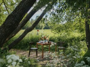 • Een lange tafel in een groene, rustige omgeving